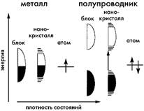 Заполнение электронных уровней в металле и полупроводнике. Энергетическая зона металла, независимо от размера его частиц, заполнена не вся, поэтому электроны могут переходить на более высокие уровни. У полупроводника же валентная зона заполнена целиком и отделена от зоны проводимости на 2—3 эВ. Из-за малых размеров полупроводниковых нанокристаллов эти зоны расщепляются, что приводит к эффективному увеличению ширины запрещенной зоны (до 4.5 эВ).