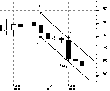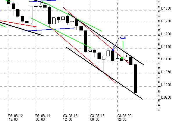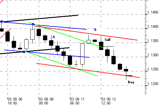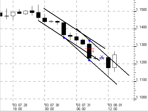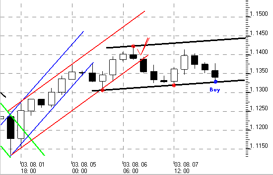 Открытие позиции - при пересечении лини ДЕЙСТВУЮЩЕГО в данное время канала. Поэтому и приходится дежурить за дисплеем, а не поставить лимитник и уйти на рыбалку. Кроме того, ордер придется постоянно двигать, канал - то наклонный, и скоро брокер Ваш начнет брать с Вас деньги за постановку и отмену ордера - "задолбаете" приказами. Как быть реально, ведь граница канала - точка, а цена движется? Я беру зону + - 5 пунктов, попадает цена в эту зону - открываюсь внутрь канала. Причем неважно, откуда приходит цена, извне канала, или изнутри. Если цена на скорости пролетает эту зону - опоздал, сижу жду дальше.