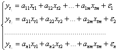 В данной системе линейных уравнений зависимая переменная одного уравнения является фактором в других уравнениях.