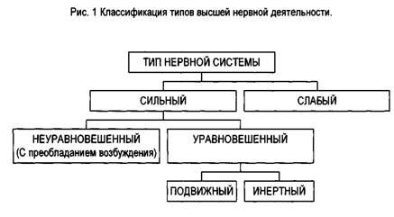 Комбінації зазначених властивостей нервових процесів збудження і гальмування були покладені в основу визначення типу вищої нервової діяльності. У залежності від сполучення сили, рухливості і врівноваженості процесів збудження і гальмування розрізняють чотири основних типи вищої нервової діяльності. Класифікація типів вищої нервової діяльності представлена на малюнку 1.