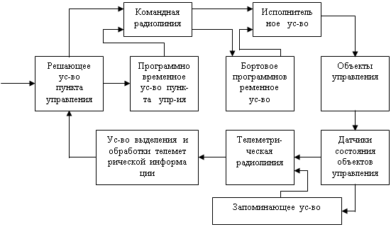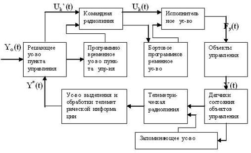 Информация о состоянии и работе объектов управления - бортовых приборов и агрегатов - получают с помощью датчиков, устанавливаемых на борту ЛА и связанных с контролируемыми величинами g (t). Полученные с датчиков и соответствующим образом обработанные величины поступают непосредственно или через запоминающее устройство на вход телеметрической радиолинии и передается по ней на пункт управления. На пункте управления в устройстве выделения и обработки телеметрической информации получается оценка состояния объектов управления g* (t), необходимая для осуществления требуемого управления бортовыми приборами и агрегатами. Формирование команд осуществляется в результате сравнения оценки g* (t) с величиной gо (t), задающей необходимое состояние объектов управления. Сформированные команды по командной радиолинии передаются на борт ЛА и поступают на исполнительное устройство, воздействующее на объекты управления. Контур радиотелемеханического управления оказывается замкнутым. В зависимости от решаемых задач, такое управление осуществляется либо как следящее, либо как корректирующее.