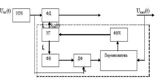 После усиления сигнал подается на преобразователь частоты, выполненный на смесителе СМ-1 и местном гетеродине МГ. На выходе смесителя образуется сигнал разностной частоты (т.1) являющейся промежуточной. Далее сигнал усиливается усилителем промежуточной частоты (УПЧ) и подается на фазовый детектор несущего колебания. СМ-1и УПЧ являются одновременно элементами схемы беззапросного измерения радиальной скорости, работа которой подробно описывалась в п. (4.2).