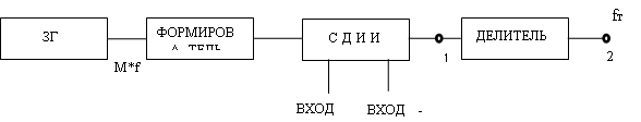 Задающий генератор вырабатывает меандр с частотой Fзг = m * f т, далее меандр поступает формирователь, формирующий короткие импульсы. Эти импульсы поступают на схему добавления и исключения единиц, которая работает следующим образом: если в момент времени между входными импульсами приходит импульс на вход +1, то в последовательность добавляется один импульс между входными; если в момент времени между входными импульсами приходит импульс на вход - 1, то из ис