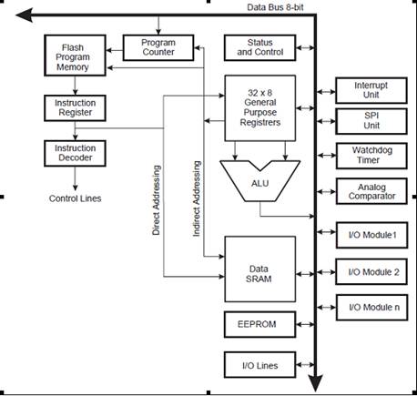 Файл регистров быстрого доступа содержит 32 восьмиразрядных регистра общего назначения, доступ к которым осуществляется за один такт системного генератора. Это позволяет арифметико-логическому устройству (ОЛУ) осуществлять большинство своих операций за один такт.