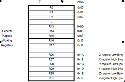 Один из этих регистров-указателей может также использоваться в качестве указателя адреса данных, размещённых в памяти программ (Flash-памяти). Эти дополнительные составные 16-разрядные регистры именуются X, Yи Z.