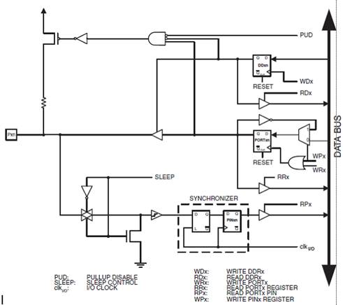 Все порты микроконтроллеров AVRв режиме цифрового ввода-вывода представляют собой полноценные двунаправленные порты, у которых каждый из выводов может работать как в режиме ввода, так и в режиме вывода. Это означает, что каждый отдельный разряд порта может быть настроен либо как вход, либо как выход, независимо от настройки всех остальных разрядов того же порта.