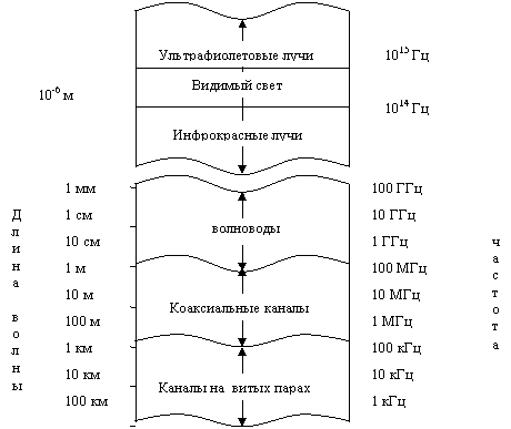 Телефонная сеть экстенсивно использует проводные линии для передачи звукового сигнала, а также данных и видеосигналов. Витые проводные пары и коаксиальный кабель в основном, дают электромагнитный канал, который обеспечивает прохождение относительно умеренной ширины полосы частот. Телефонный провод, обычно используемый, чтобы соединить клиента с центральной станции, имеет ширину полосы несколько сотен килогерц. С другой стороны, коаксиальный кабель имеет обычно используемую ширину полосы частот несколько мегагерц. Рисунок 2.1 поясняет частотный диапазон используемых электромагнитных каналов, которые включают волноводы и оптический кабель.