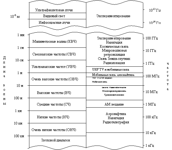В системах беспроводной связи (радиосвязи) электромагнитная энергия передается в среду распространения антенной, которая служит излучателем. Физические размеры и структура антенны зависят, прежде всего, от рабочей частоты. Чтобы получить эффективное излучение электромагнитной энергии, размеры антенны должны быть больше, чем 1/10 длины волны. Следовательно, передача радиостанции с AM на несущей, допустим, fc = 1 МГц, соответствующей длине волны λ = с/fс. = 300 м, требует антенны с диаметром, по крайней мере, 30м. Рисунок 2.2 поясняет различные диапазоны частот для радиосвязи. Способы распространения электромагнитных волн в атмосфере и в свободном пространстве можно разделить на три категории, а именно: распространение поверхностной волной, распространение пространственной волной, распространение прямой волной. В диапазоне очень низких частот (ОНЧ) и звуковом диапазоне, в которых длины волн превышают 10 км, земля и ионосфера образуют волновод для распространения электромагнитных волн. В этих частотных диапазонах сигналы связи фактически распространяются вокруг всего земного шара. По этой причине эти диапазоны частот, прежде всего, используются во всём мире для решения навигационных задач с берега до кораблей.