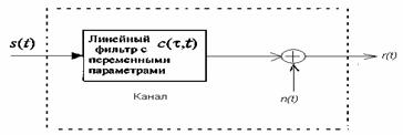 Линейный фильтровой канал с переменными параметрами. Физические каналы, такие как подводные акустические каналы и ионосферные радиоканалы, которые возникают в условиях меняющегося во времени многопутевого распространения передаваемого сигнала, могут быть описаны математически как линейные фильтры с переменными параметрами. Такие линейные фильтры характеризуются меняющимися во времени импульсной характеристикой канала c(τ,t), где с(τ,t) – отклик канала в момент времени t на 8-импульс, поданный к входу в момент t= τ.