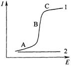 Рис. 5.1 Вольтамперная кривая в присутствии (1) и отсутствии (2) электрохимически активного соединения