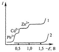 Рис. 5.2 Полярограмма раствора содержащего ионы Cd2+, Zn2+, Ni2+, Со2+ на фоне 1М раствора KCl (1): полярограмма фона (2).