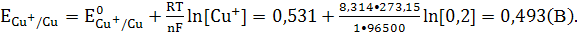 Стандартный потенциал пары Cu+/Cu равен 0,531 В. Можно пренебречь тем, что при нормальных условиях это значение изменится (так как это изменение будет не значительное).