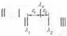 Для определения длины волны заданной линии лх измеряют расстояние а1 от этой линии до ближайшей к ней линии спектра железа, длина волны которой л1 точно известна, и расстояние а2 от линии лх до другой линии с известной длиной волны л2. В небольшом спектральном интервале дисперсия прибора остается постоянной, поэтому можно записать пропорцию