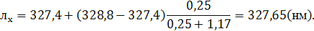 10. (6,10-11) Определить длину волны неизвестной линии лх, если линии железа л1 = 327,4 нм и л2 = 328,8 нм находятся от нее на расстояниях соответственно 0,25 мм и 1,17 мм
