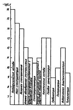 Концентрационная чувствительность метода или методики определяется тем минимальным количеством вещества, которое можно обнаруживать или определять данным методом, по данной методике. На рис. 15.1 приведена относительная характеристика чувствительности некоторых методов. Нижняя граница определяемого содержания демонстрирует возможности метода и наилучший результат, достигаемый при определении ряда веществ.