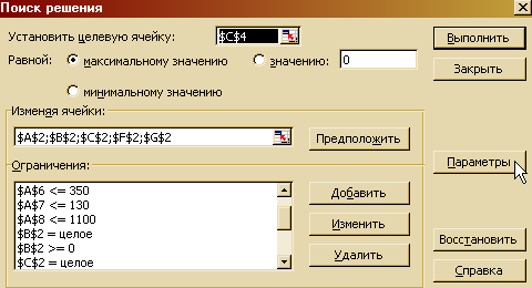 Открыв в меню «Сервис» команду «Поиск решения», заполним открывшееся окно: установим целевую ячейку, равную максимальному значению, определим ячейки-переменные, значения которых искомы, установим систему ограничений по имеющимся запасам сырья и располагаемой трудоемкости.