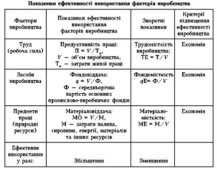 Зростання продуктивності праці, з іншого боку, сприяє збільшенню обсягу випуску продукції, що дає змогу повніше задовольняти суспільні потреби. Зростання обсягів виробництва, у свою чергу, впливає і на скорочення витрат виробництва, і на загальну суму прибутку, рентабельність господарювання. Отже, підвищення продуктивності праці складає основу збільшення національного прибутку, а підвищення ефективності виробництва — сутність і основу економічного прогресу суспільства. Оскільки підприємства складають основу економіки країни незалежно від форми власності, розглянемо головні показники ефективності на рівні підприємства (табл. 1).