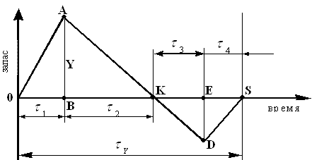 На рис.1.1. показан самый общий случай образования (ОА), расходования (АК) запаса, затем возможное образование дефицита (КD) и его удовлетворения (DS). В точке S вновь начинается формирование запаса, так что временной отрезок OS представляет собой продолжительность рассмотренного цикла.