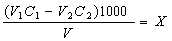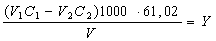 де V1\ — об'єм розчину соляної кислоти, добавлений до проби води, см3; С1 — концентрація розчину соляної кислоти, добавленої до проби води, моль-екв/дм3; V2 — об'єм стандартного розчину бури, витрачений на титрування залишку соляної кислоти, см3; С2 — концентрація стандартного розчину бури, витраченого на титрування залишку соляної кислоти, моль-екв/дм3; V— об'єм проби води, см; 61,02 — молярна маса еквівалента гідрокарбонат-іонів.