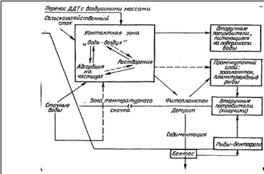 Как видно из схемы, цикл круговорота ДДТ в гидросфере может быть охарактеризован следующим образом: