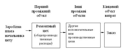 Накладні витрати пройдуть не один об'єкт, перш ніж потрапити на дане замовлення, наприклад заробітна плата начальника ремонтного цеху може бути прямо включена тільки в загальновиробничі витрати даного цеху (проміжний об'єкт). Подальший шлях цих витрат можна простежити за схемою: