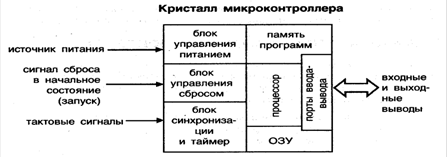 Микроконтроллер помимо центрального процессора (ЦП) содержит память и многочисленные устройства ввода/вывода: аналого-цифровые преобразователи, последовательные и параллельные каналы передачи информации, таймеры реального времени, широтно-импульсные модуляторы (ШИМ), генераторы программируемых импульсов и т.д. Его основное назначение - использование в системах автоматического управления, встроенных в самые различные устройства: кредитные карточки, фотоаппараты, сотовые телефоны, музыкальные центры, телевизоры, видеомагнитофоны и видеокамеры, стиральные машины, микроволновые печи, системы охранной сигнализации, системы зажигания бензиновых двигателей, электроприводы локомотивов, ядерные реакторы и многое, многое другое. Встраиваемые системы управления стали настолько массовым явлением, что фактически сформировалась новая отрасль экономики, получившая название Embedded Systems (встраиваемые системы).