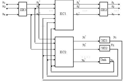 В приведенной схеме наборы значений входных переменных x1, x2,…, xn соответствуют буквам входного алфавита Р абстрактного автомата, наборы выходных переменных z1, z2,…, zm - буквам выходного алфавита W, y1, y2,…, yh - состояниям абстрактного автомата.
