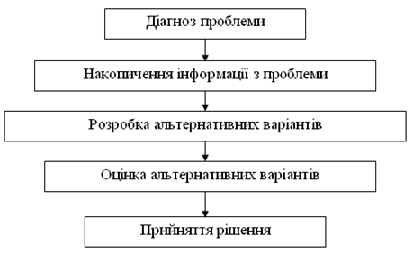 Виявлення проблемної ситуації являє собою перший етап процесу прийняття рішень. Процес прийняття управлінських рішень з урахуванням фактору часу складається з наступних етапів, котрі зображенні на рисунку 1.2.