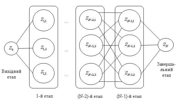 На рисунку 1.5 схематично кругами зображені можливі стани на кожному етапі, лініями – можливі переходи від одного стану до іншого за вибору певного управління. Таким чином, стан процесу на і-му етапі визначається певною функціональною залежністю від стану на попередньому кроці та значеннями параметрів управління на початку чергового кроку, тобто