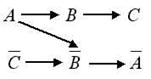 Рассмотрим пример условного экзистенциального суждения. Пусть задана простая E‑структура с двумя суждениями: A®B и B®C. Построим ее CT‑замыкание и выделим все максимальные верхние конусы: