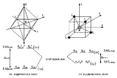 Орбитали dx²–y² и dz² совпадают с координатными осями, а остальные три (dxy, dxz, dyz) проходят вдоль биссектрис соответствующих координатных углов. B отсутствие лигандов все пять орбиталей были энергетически равноценны. Но с появлением лигандов в вершинах октаэдра электроны, находящиеся на орбиталях dx²–y² и dz², испытывают сильное отталкивание от отрицательно заряженных лигандов или от отрицательного конца полярной молекулы. Другие три орбитали попадают в области с минимальными значениями отрицательного потенциала, поэтому вероятность нахождения электрона на орбиталях dxy, dxz, dyz будет больше. Это соответствует тому, что под действием лигандов прежде энергетически равноценные d-орбитали разделились на две группы: орбитали dx²–y² и dz²(dγ), энергетически невыгодные для электрона, и орбитали dxy, dxz, dyz(dε) с меньшей энергией. Схема расщепления d-орбиталей октаэдрическим (тетраэдрическим) окружением показана на рис. 1. Разность между dε и dγ-уровнями обозначается через Δокт (Δтетр) и называется параметром расщепления. В научной литературе орбитали обычно dγ и dε обозначают deg и dt2g, а параметр расщепления 10Dq (1).