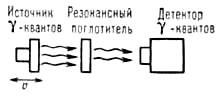 Рис. 3. Упрощенная схема мессбауэровского спектрометра; источник γ-квантов с помощью механического или электродинамического устройства приводится в возвратно-поступательное движение со скоростью u относительно поглотителя. С помощью детектора измеряется зависимость интенсивности потока γ-квантов, прошедшего через поглотитель от скорости (3).