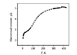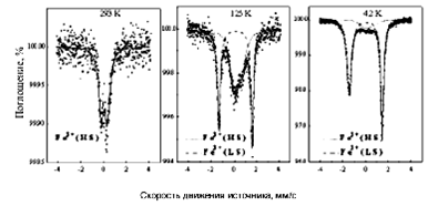 Рис. 4. Температурная зависимость магнитного момента комплекса (Fe(RSalen)2)+PF6- (А) и мессбауэровские спектры комплекса Fe при температурах 293, 125 и 4,2 К (Б)(5).