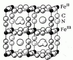 Из неё видно, что атомы Fe2+ и Fe3+ располагаются в кристаллической решётке однотипно, однако по отношению к цианидным группам они неравноценны, преобладает тенденция к размещению Fe2+ между атомами углерода, Fe3+ - между атомами азота, ионы К+ и молекулы H2O располагаются в пустотах кристаллической решетки.