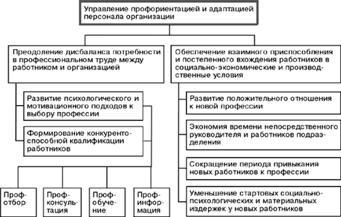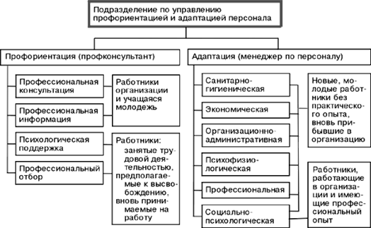 Для достижения этих целей в организациях целесообразно иметь в действующих подразделениях по управлению персоналом специалистов или самостоятельное подразделение по управлению профориентацией и адаптацией кадров. Штат такого подразделения должен состоять как минимум из двух человек: профконсультанта (профессиональная ориентация) и менеджера по персоналу (отбор, подготовка и адаптация работников). В осуществлении процесса адаптации непосредственное участие принимают линейные руководители. Функции этого подразделения должны быть ориентированы на работников, которым нужна помощь в профессиональной ориентации и переориентации, а также выпускников подшефных школ, которые стоят перед выбором своей дальнейшей профессии, и на новых работников, пришедших в организацию или поменявших место работы внутри нее.