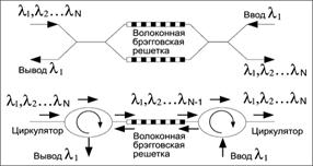 Рисунок 2.4 Использование волоконных брэгговских решеток в мультиплексорах ввода/вывода каналов.