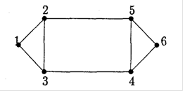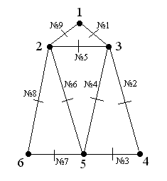 Наочно граф можна уявляти як геометричну конфігурацію ( див. рис.1.7), яка складається з точок (вершин графу 1,2,3,4,5,6) і ребер (ліній або відрізків №1(1-3), №2(3-4), №3(4-5), №4(3-5), №5(2-3), №6(2-5), №7(5-6), №8(6-2), №9(2-1), які сполучають деякі точки (вершини) за вибраним алгоритмом обходу вершин графу) (5).
