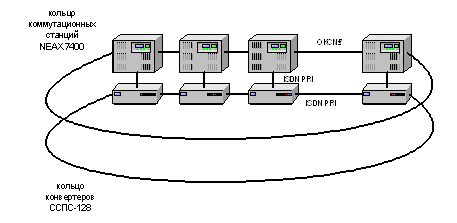 Логическая структура сети (рисунок 1.3) образована двумя кольцами: конвертеров ССПС-128 соединенных каналами ISDN PRI и станций NEАХ 7400 соединенных каналами ОКС№7 между собой. При этом ССПС-128 и NEАХ 7400 соединяются на одной станции. Отдельные кольца объединяются между собой как показано на (рисунке 1.4), с использованием мостового конвертера.