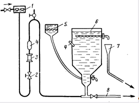 1 — бак постоянного уровня; 2 — регулирующий вентиль; 4 — термометр; 5 — воронка приема реагента; 3— ротаметр; 7 — прием и отвод раствора реагента; б — сатуратор одинарного насыщения; 8 — сброс в канализацию
