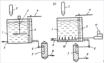 Рис. 16.2. Фтораторная установка с растворным баком с механическим побуждением (а) и с барбатированнем (б).