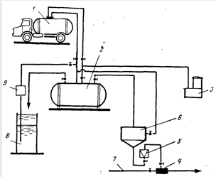 Рис. 16.3. Фтораторная установка с использованием кремнефтористоводородной кислоты. 1, 2 — авто- и стационарная цистерна; 3 — воздуходувка; 4 — эжектор; 5 — ротаметр; 6 — бак-мерник; 8 — емкость; 9 — ручной насос; 7 — водопровод