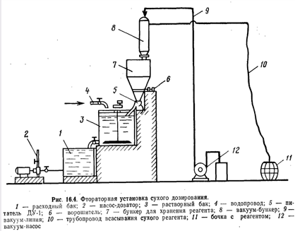 Во фтораторных установках с растворными баками (рис. 16.2) в качестве реагента применяют кремнефтористый натрий. Загрузку в баки реагента осуществляют с помощью бункеров, оборудованных вибраторами и дозаторами барабанного типа. Для лучшего растворения реагента баки оборудованы мешалкой с частотой вращения 50...60 мин-1. Время перемешивания 2 ч. время отстаивания 2 ч. Концентрация раствора реагента в баках составляет 0,05% по фтору или 0,08% по чистой соли.