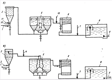 Рис. 16.5. Технологическая схема дефторирования воды свежеобразованным гидроксидом магния (а) и солями алюминия (б).