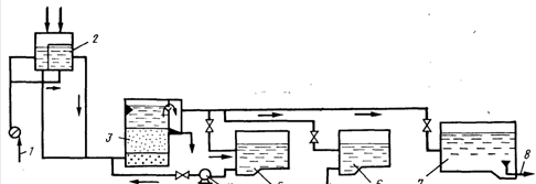 1 — насос подачи исходной воды; 2 — промежуточная емкость; 3 — скорый фильтр или К.О3; 5 — промывной насос, бак; 6 — бак регенерационного раствора; 7 — резервуар обесфторенной воды; 8 — подача обесфторенной воды потребителю