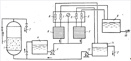 1 — фильтр предварительной очистки; 2, 10 — подача исходной и отвод обесфтореиной воды; 4 — бак осветленной воды; 5 — насос высокого Давлении; 6 — гиперфильтрационные аппараты; 8 — ротаметры; 7 — манометр; 9 — бак обеефторенной воды; 11 — бак концентрата; 3 — сброс в Канализацию; 12 — насос