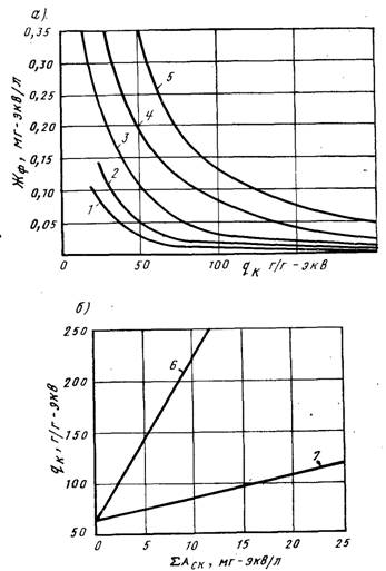 Рис. 20.18. Определение удельного расхода серной кислоты qKна регенерацию водород-катионитных фильтров в зависимости от требуемой жесткости фильтрата (ЖФ) и общего солесодержания исходной воды в мг-экв/л (а) и от суммарного содержания анионов сульфатов и хлоридов (б)