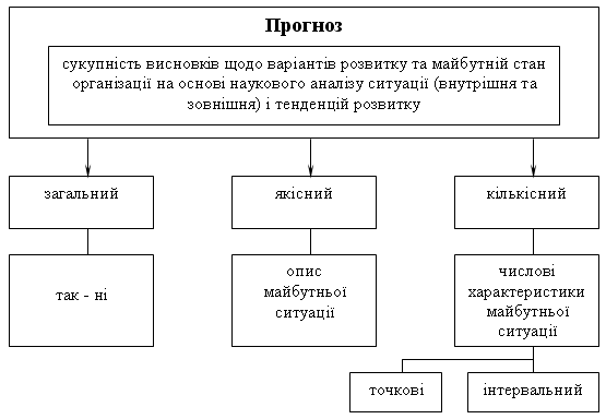 Прогнози можна умовно розділити на три види: загальний прогноз – відповідає на запитання про можливість чи неможливість настання деякі події; якісний прогноз – передбачає опис майбутньої ситуації; кількісний прогноз – передбачає визначення числових характеристик майбутньої ситуації на основі точкових або інтервальних оцінок, котрі зображені на рисунку 1.1.