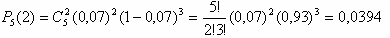 Рішення: Маємо схему Бернуллі з параметрами p=7/100=0,07 (імовірність того, що акумулятор вийде з ладу), n = 5 (число випробувань), k = 5-3 =2 (число "успіхів", несправних акумуляторів). Будемо використовувати формулу Бернуллі (імовірність того, що в n випробуваннях подія відбудеться k раз).