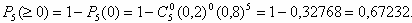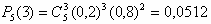 Рішення: Маємо схему Бернуллі з параметрами p = 0,2 (імовірність того, що елемент відмовить), n = 5 (число випробувань, тобто число елементів), k (число "успіхів", що відмовили елементів). Будемо використовувати формулу Бернуллі (імовірність того, що для n елементів відмова відбудеться в k елементах):