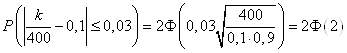 №20. Імовірність того, що деталь не стандартна, p=0,1. Знайти ймовірність того, що серед випадково відібраних 400 деталей відносна частота появи нестандартних деталей відхилиться від імовірності p=0,1 по абсолютній величині не більш, ніж на 0,03.